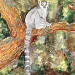 Bailey’s mixed media creation depicts a ring tailed lemur holding leaves, fruit, and a giraffe weevil.