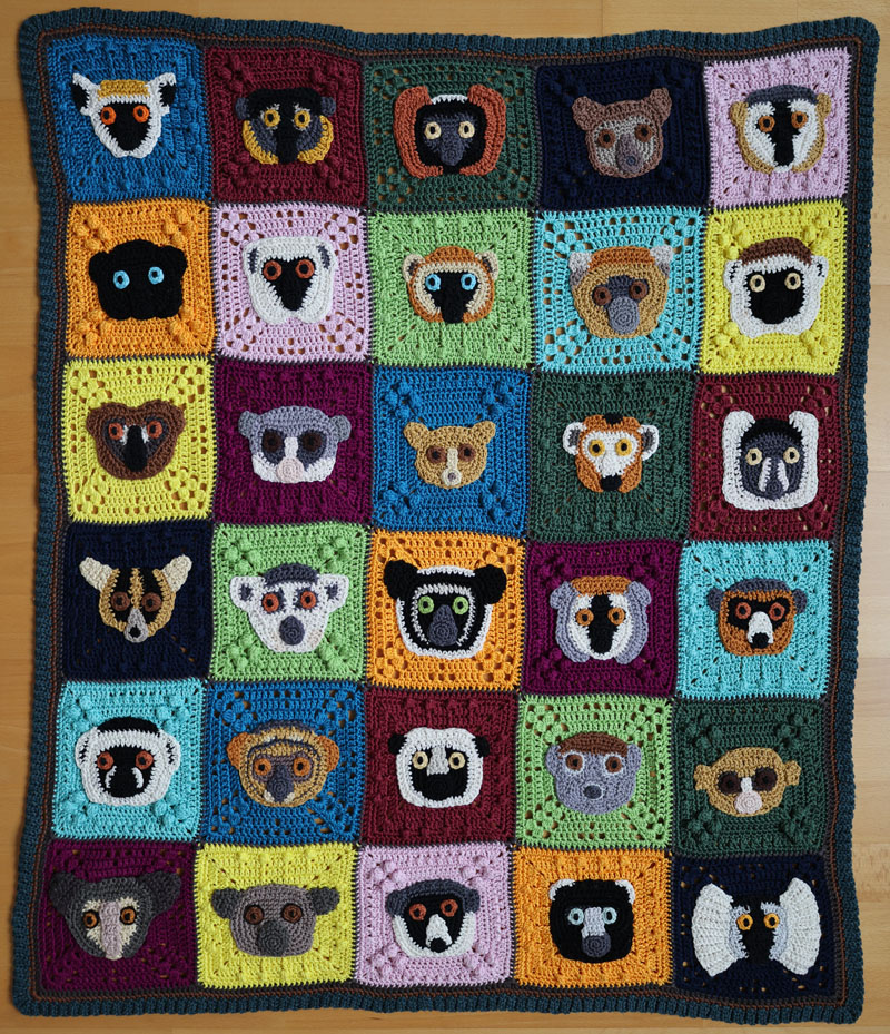 “This crochet artwork highlights the diversity of lemurs,” Amrei said. “On 30 squares, 27 different species from all 15 genera of lemur are represented.