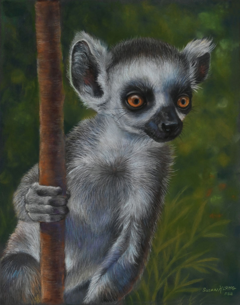 Susan’s piece is a pastel painting of a young ring-tailed lemur, whose expressive eyes are alight with curiosity and discovery.