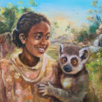 Taraoo’s vivid acrylic and oil painting depicts a red ruffed lemur in peril, facing horrific habitat destruction.